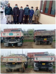 Baramulla, Mar 20: Police under the supervision of Sh. Javid Ahmad-JKPS SDPO Tangmarg assisted by Insp Nisar Ahmad, SHO PS Kunzer during routine patrolling at Ferozpora Nallah Kunzer seized 4 Tipper on spot and arrested 4 persons namely Shabir Ahmad Chopan S/O Habibullah Chopan R/O Ganiwani Kunzer, Zahoor Ahmad Bhat S/O Mohd Sultan Bhat R/O Lalpora Kunzer, Aamir Ahmad Reshi S/O Ab Ahad Reshi & Mohd Altaf Malik S/O Gh Mohi Din Malik residents of Pariswani Kunzer who was involved in illegal excavation/ transportation of minerals from Ferozpora Nallah Kunzer.